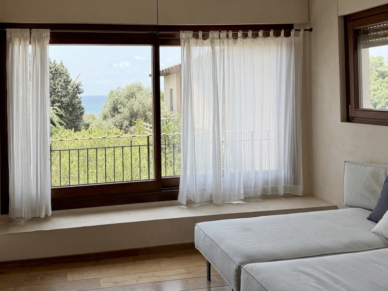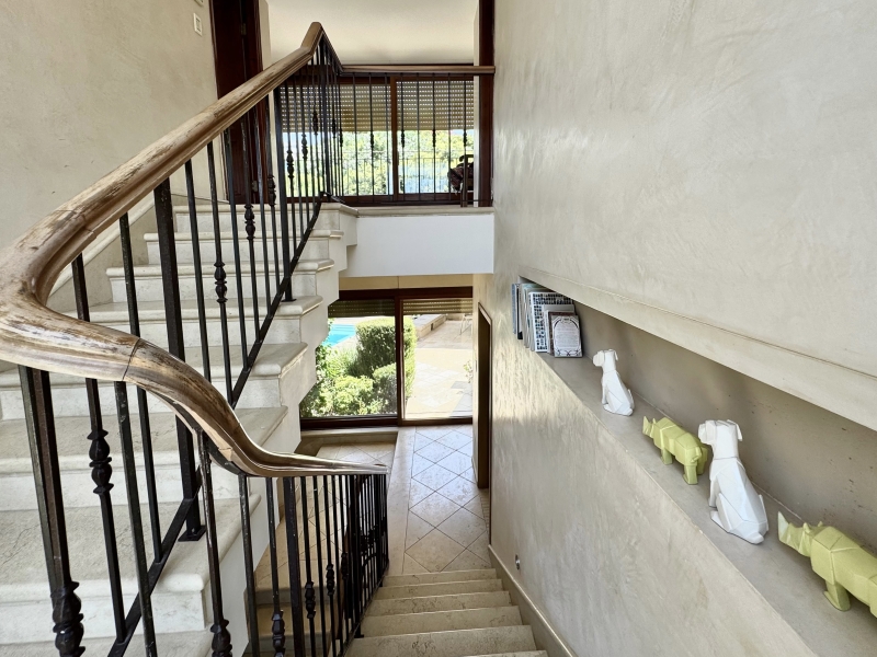 На входном уровне находятся гостиная и кухня, светлый салон с выходом в ухоженный сад, зелёный двор с частным бассейном и окна разных размеров с видом на сады, бассейн и даже море.