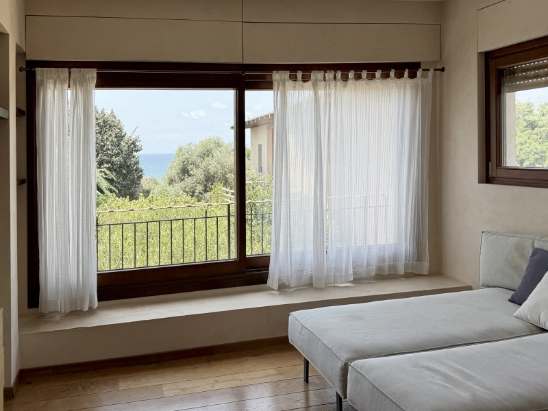 На входном уровне находятся гостиная и кухня, светлый салон с выходом в ухоженный сад, зелёный двор с частным бассейном и окна разных размеров с видом на сады, бассейн и даже море.